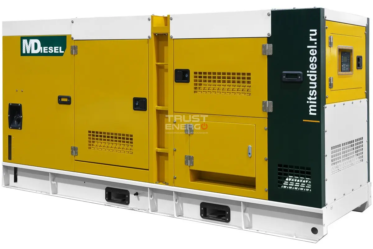 Дизельный генератор MitsuDiesel МД АД-300С-Т400-1РКМ29 в шумозащитном кожухе номинальной мощностью 300 кВт с двигателем Mitsudiesel - отличный дизельный электроагрегат демонстрирующий уверенный приём нагрузки как резервный источник питания, так и основной.